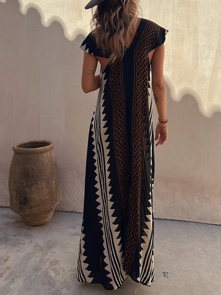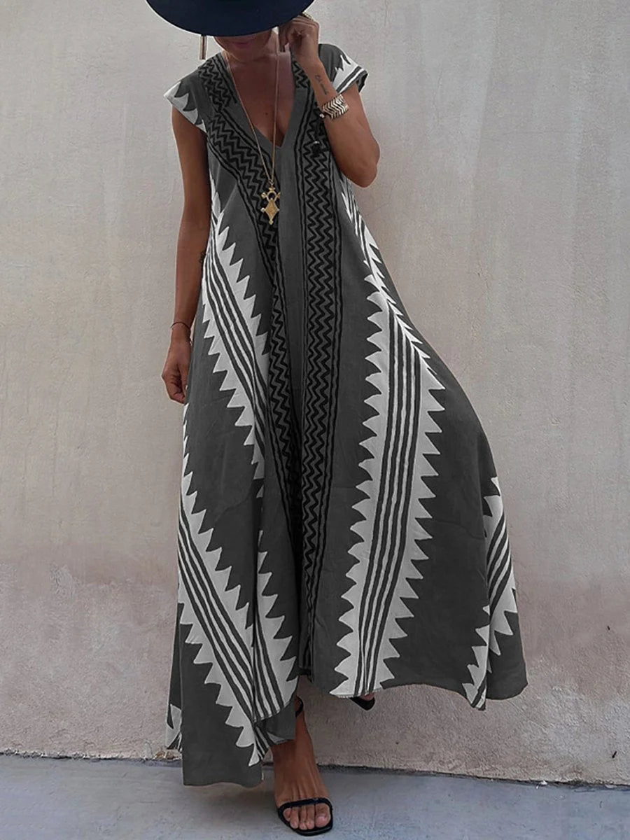 Siente la libertad y el magnetismo del estilo bohemio moderno con nuestro vestido boho de escote en V. Diseñado para mujeres que no temen destacar, combina una silueta fluida que estiliza con un estampado geométrico que captura miradas. Ideal para paseos al atardecer, vacaciones junto al mar o cenas al aire libre.